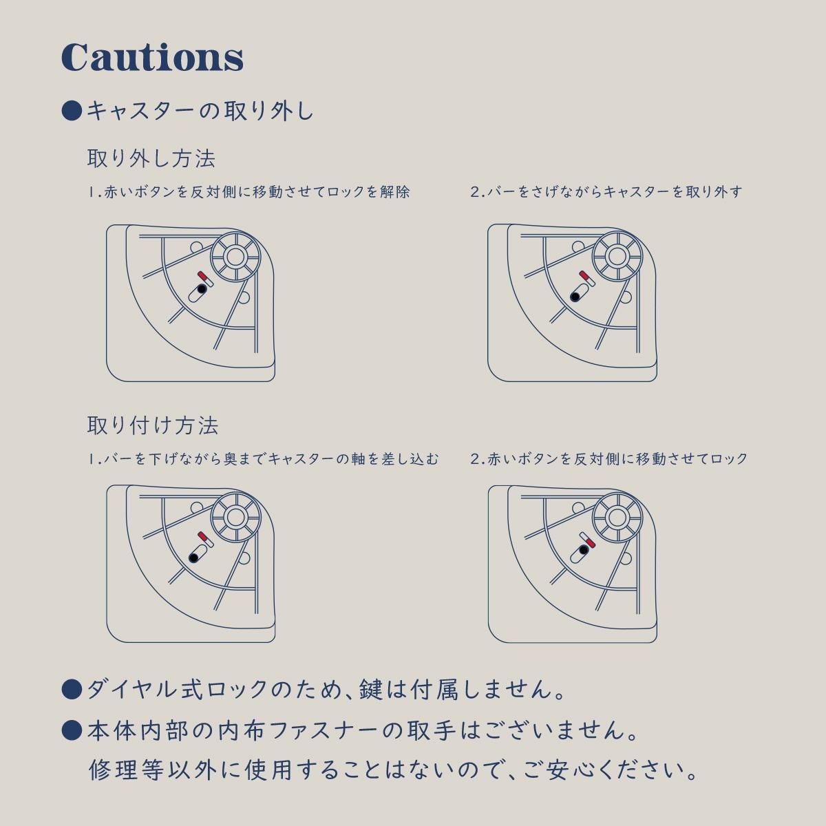 簡単3STEPで取り外し可能。スーツケースの破損箇所で多いキャスター。一般的なスーツケースのキャスター交換には工具が必要ですが、工具不要の簡単操作で交換が可能です。キャスターの軸ごとに取り外せるので、室内での保管にも優れています。また、キャスタに静音8輪キャスターを採用することで、内蔵されたサスペンションが海外の石畳の振動・ゴロゴロ音を吸収し、スムーズな走行を実現しました。