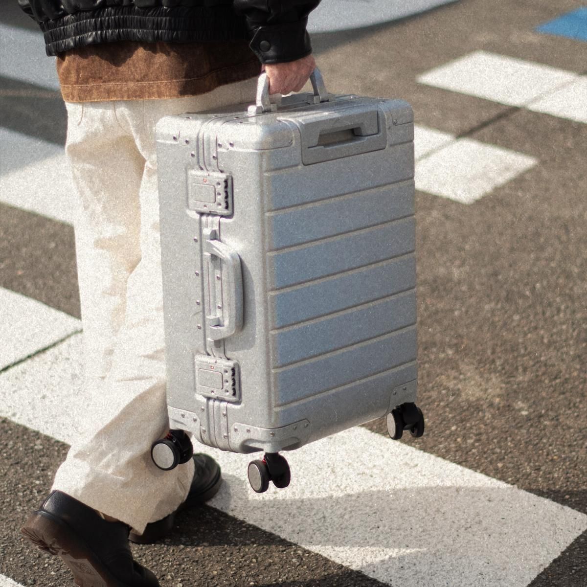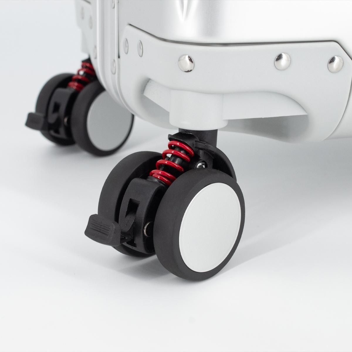 人気のアルミボディスーツケースの2つのキャスターに動作を制御するストッパーを搭載しました。電車やバス、坂道などスーツケースが動いてしまうシーンでもキャスターについているストッパースイッチを操作することで、ストッパーのON/OFFが可能に。手を使わずに操作できるため、手が塞がっていても操作ができます。