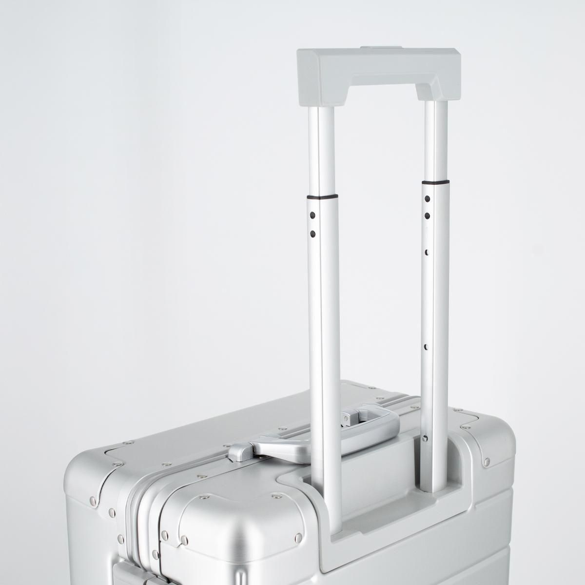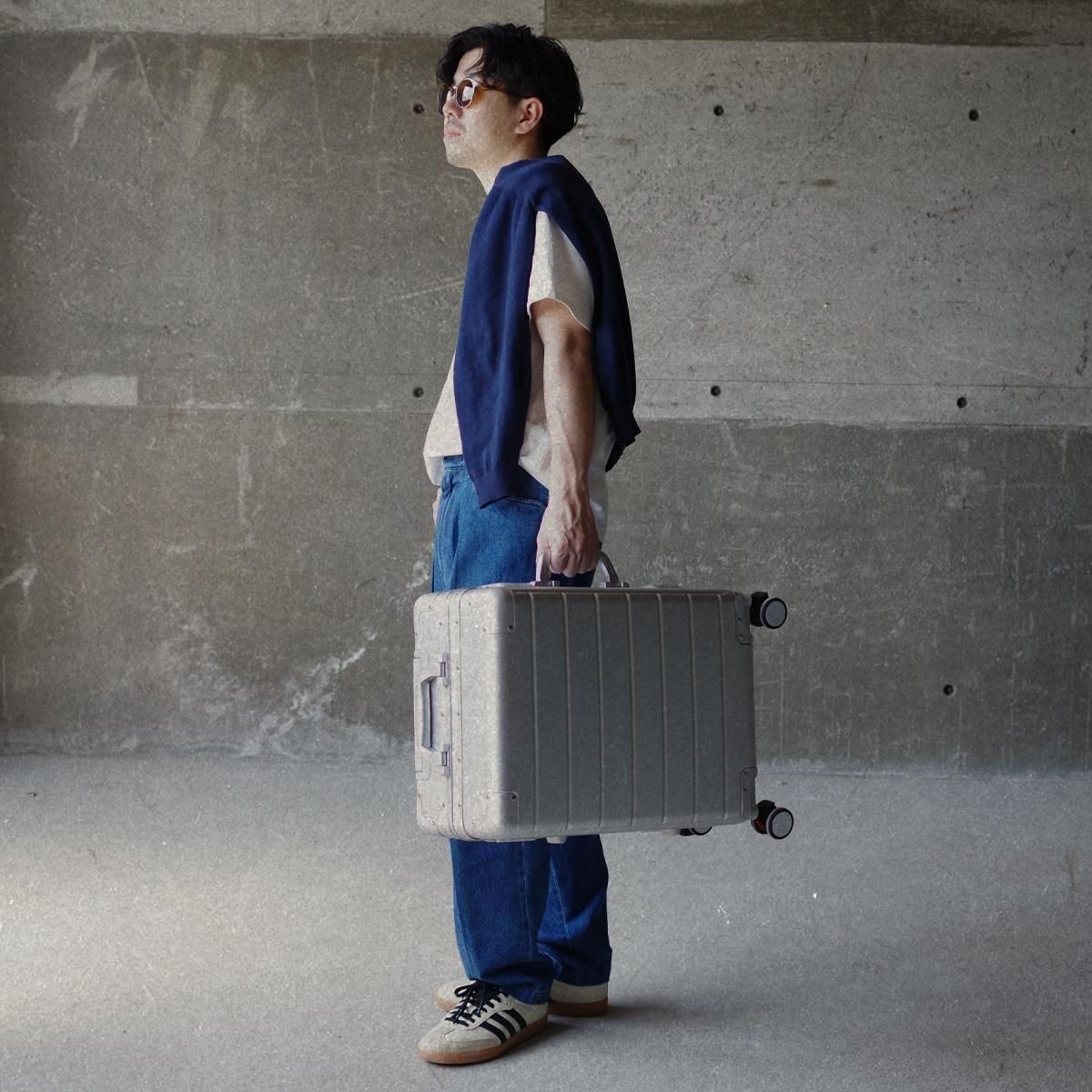 ボディにはレーシングエンジンや飛行機の材質と同じ「アルミニウム合金メタル」を採用しています。アルミニウム合金メタルは通常のアルミニウムより耐荷重が大きく、耐食性・耐疲労性に優れています。また、スーツケース上部のコーナーパットには、厚みのあるアルミニウム合金を採用しています。機内やバスなどの輸送中、最もダメージの受けやすいコーナーを衝撃から大切なお荷物を守ります。