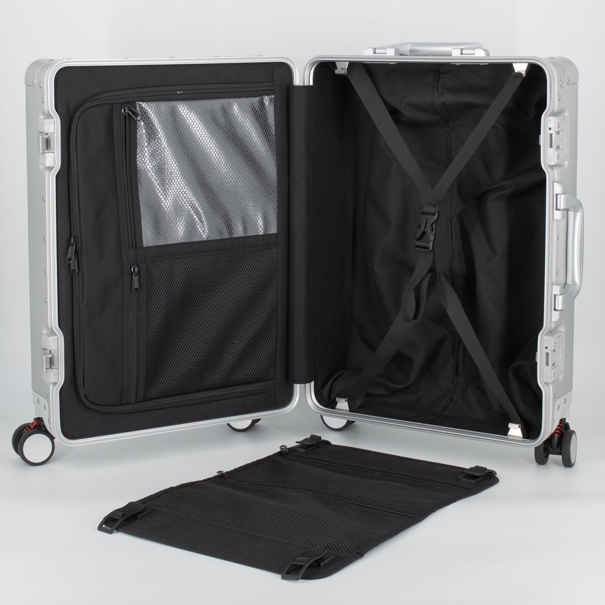 前シェル側は湿ったものを収納可能なビニールポケット搭載のジッパータイプです。そのため、不意に人前でスーツケースを開けることがあっても中が見えないようになっています。また、後ろシェル側はクロスベルトに取外し可能なメッシュポケット付き中仕切り仕様となっています。
